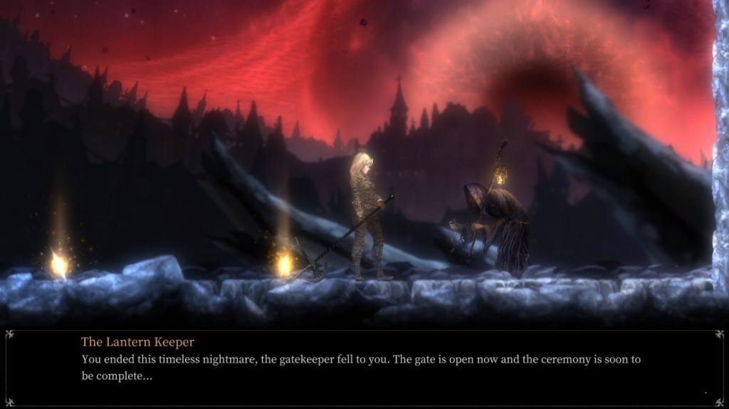 The boss fight in this area is not particularly challenging but it does require a modest amount of patience and, for a few levels, always seemed to be just within reach of being beaten. I actually spent a few days on this fight and did a lot of grinding for it without realizing the amount of time and effort I was putting into it. Maybe that’s good design or just a happy coincidence, but either way the Lantern Keeper soon shows up to tell us we have “ended the timeless nightmare”. Is Leila’s trial finished now? What does that mean, exactly?