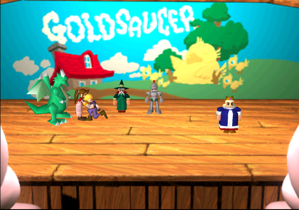 So. The torn film in the game over screen and the buster sword, spotlit as if onstage, are tucked into forgettable moments like losing battles and starting the game up. As out-of-the-way as they are, though, they point directly toward a kind of metafiction. When I first played the game on PC, the glitchy train attendant all but convinced me that FFVII was “acted out” with dolls, like Super Smash Bros. There are less direct indications, though, that also point to toy metaphors.