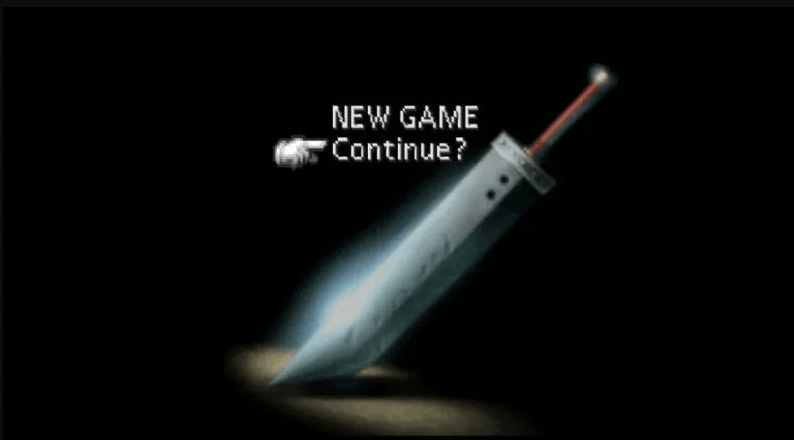Before this early stage of the game, there are other indications of non-literal storytelling that could be easily overlooked. The game begins with a long credits roll, like a film. The starting screen does not have a logo. The only text are your two options: ‘New Game’ and ‘Continue.’ The only image is Cloud’s buster sword, angled with it’s point downward, surrounded by a spotlight. If you manage to get KO’d, you’ll see a game over screen with a broken strip of film and a film reel canister off to the side. If you see that screen before escaping from the reactor, the old-fashioned cars and cobblestones imply an even more direct classic film aesthetic. The only thing that stops me from making comparisons with noir is that there are too many colors (however subdued).
