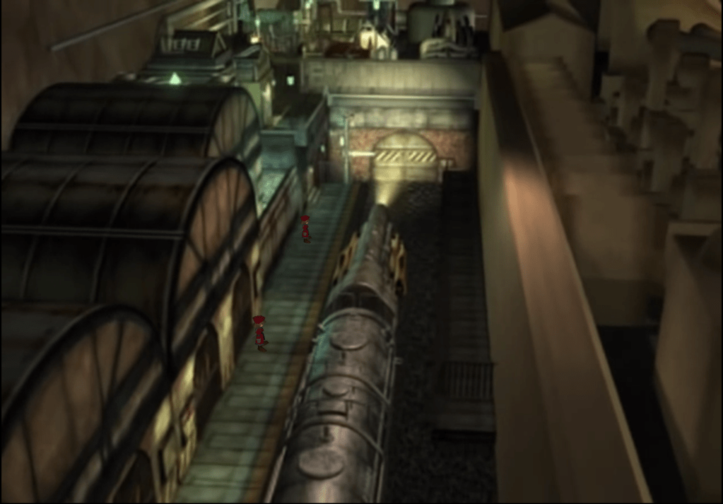 The use of the chibi-doll polygons against the pre-rendered backgrounds brought a level of surrealism. When I first played FFVII on the PC around 2000, there was a glitch in the opening FMV and one of the chibi train attendants was briefly superimposed over the crowded streets of Midgar. As the camera rose over the cityscape, the train attendant who looked like a doll ran offscreen.