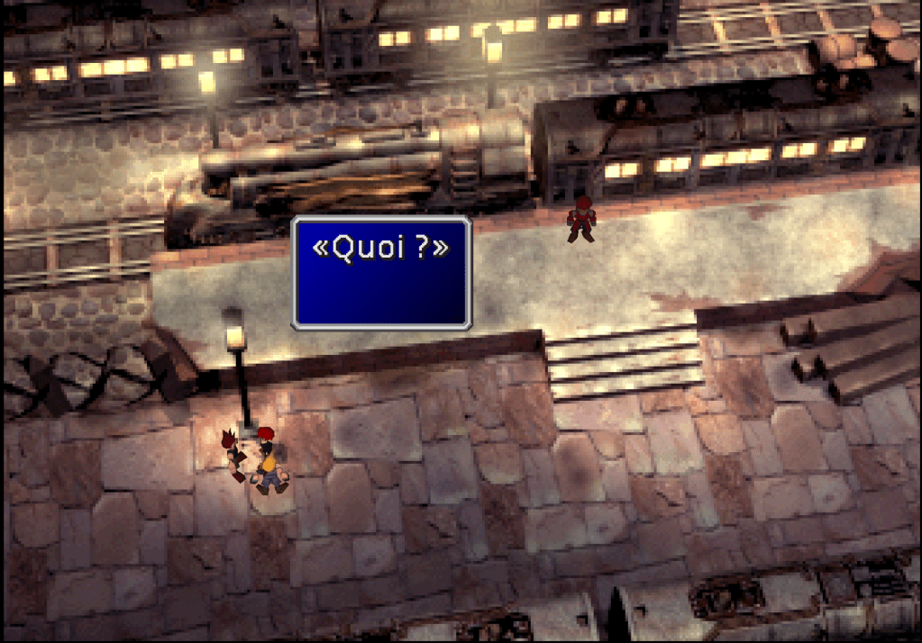 We’re in the Sector 7 slums, under a plate, but a brief cut appears to take us near a water tower under a night sky. The adult chibi-dolls are soon replaced by child chibi-dolls. Another cut brings us back to the bar beneath the plate. The player learns, later on, that the flashback depicted something that happened on a separate continent.