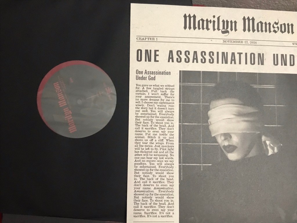 The version of One Assassination Under God – chapter 1 in the waking world is also an odd little album. The chapter 1 part makes me think of the narrative ambition and conceptual wheels within wheels within Holy Wood. If so, I’ll be happy to see it manifest in future chapters. I’ve always loved him best when he goes artsy and esoteric.