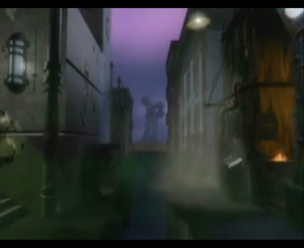 The view of the Nerve Tower upon spawning into existence likewise appears bracketed by two structures, like the alley in the opening cut scene. Even the same three Sense Spheres in evidence (I think…?).