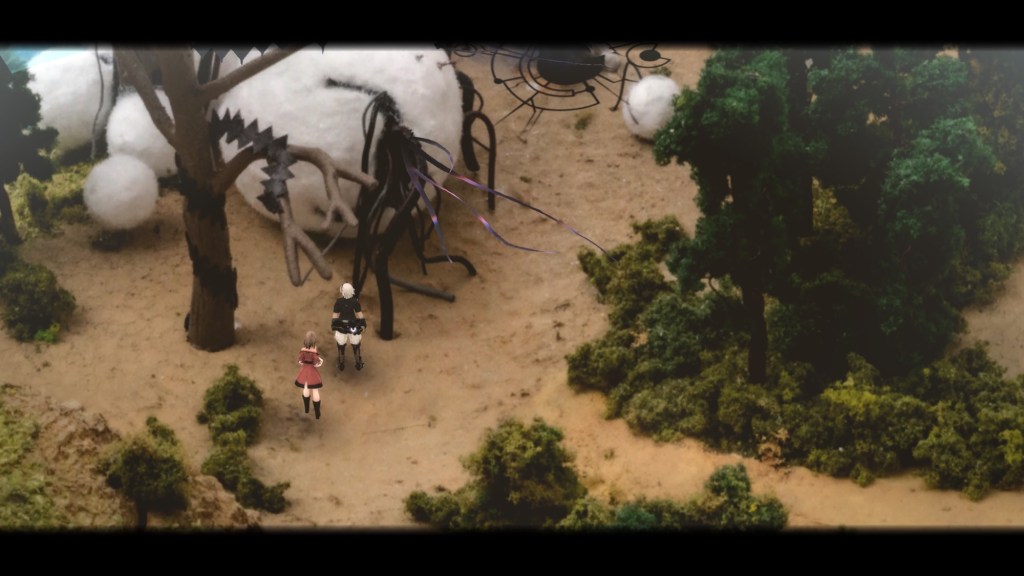 In the intro, I spent a lot of time on the aesthetic motivations behind Final Fantasy character design leading up to and including VII. Hironobu Sakaguchi has explained that, up through VII, characters were modeled after puppets in dioramas. Since the influence of Dungeons & Dragons is all over Final Fantasy, I’ve occasionally wondered if they were also modeled after miniatures on a map. Especially given how the combat screens from the 16 bit games retained the chibi-doll character sprites whereas the monsters looked hand-drawn or painted. VII used the symbolism of non-literal chibis to acquaint the player with non-literal imagery in general, to build a foundation for a larger-than-life story.